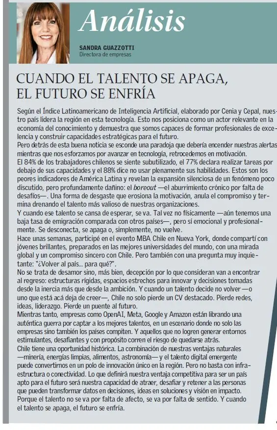 No se trata de desamor, sino más bien, decepción por lo que consideran van a encontrar al regreso: estructuras rígidas, espacios estrechos para innovar y decisiones tomadas desde la inercia más que desde la ambición. Y cuando un talento decide no volver -o uno que está acá deja de creer-, Chile no solo pierde un CV destacado. Pierde redes, ideas, liderazgo. Pierde un puente al futuro.